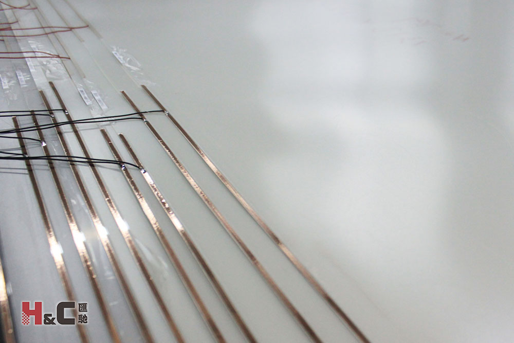 準確來說,調光玻璃需要通電的不是玻璃,而是它中間的液晶膜。液晶膜與電線的連接部分,就叫做電極。電極主要由銅箔構成,把它牢固地粘在液晶膜的導電層上,再焊上電線,就接連起來了。