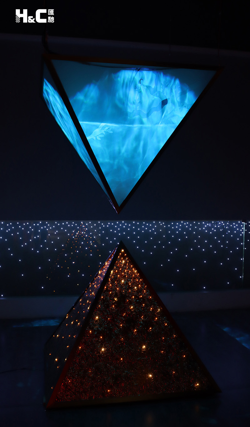 發光金字塔是用金碧莎玻璃、金茶鏡、LED燈珠以及特種紙等材料,經過設計與藝術處理,再通過高溫夾膠制作而成的LED發光玻璃裝置。設計構思獨特,效果炫麗新奇,滿足了人們對裝飾風格多樣和美感的追求。
