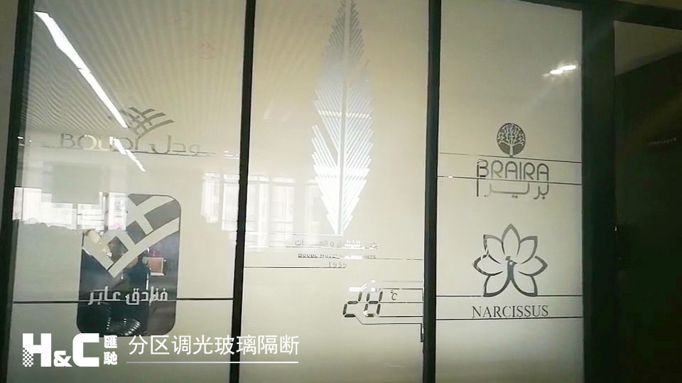 圖為雕繪了文字和圖案的分區調光玻璃,用于室內隔斷,把公司的品牌LOGO印在上面,表現出濃濃的創意感和科技感。通電的區域變透明,即顯示圖案;不通電的區域霧化,即不顯示圖案。