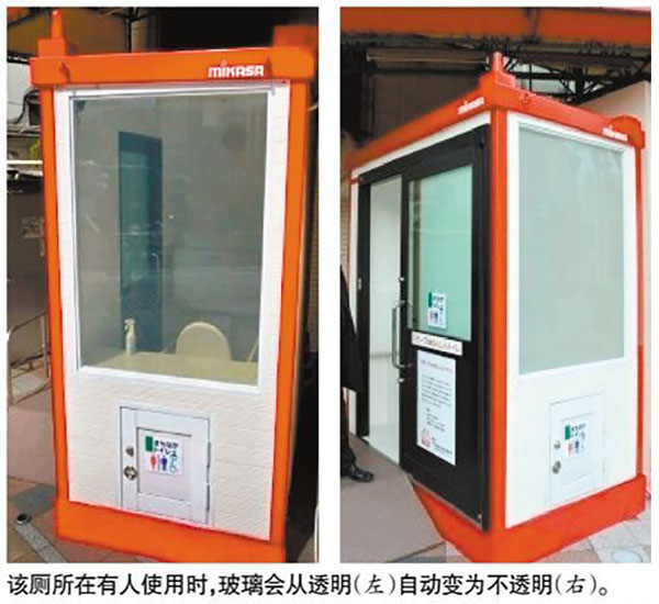 在日本大分市中心商業(yè)街街頭有一個應(yīng)用霧化玻璃的公廁(如下圖)。當(dāng)廁所里面沒人時,從外面看一覽無余,有人進入后,廁所里的傳感器就會感應(yīng),讓玻璃變霧化。
