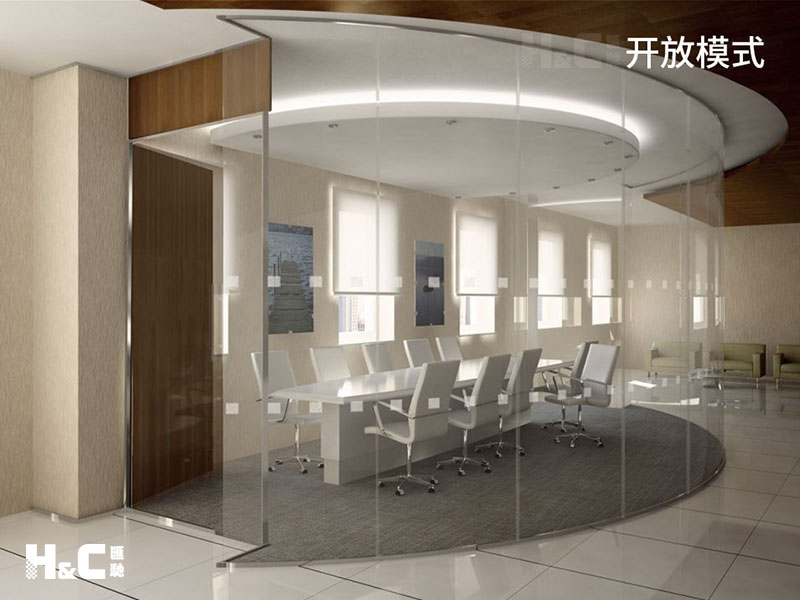 也就是把玻璃調整到透明狀態,讓兩個空間相互連接,里面可以看到外面,外面也能看到里面。這種模式主要在領導辦公時使用,可以擴大視野區域,減少空間的壓抑感,也便于領導了解外面的員工工作情況。