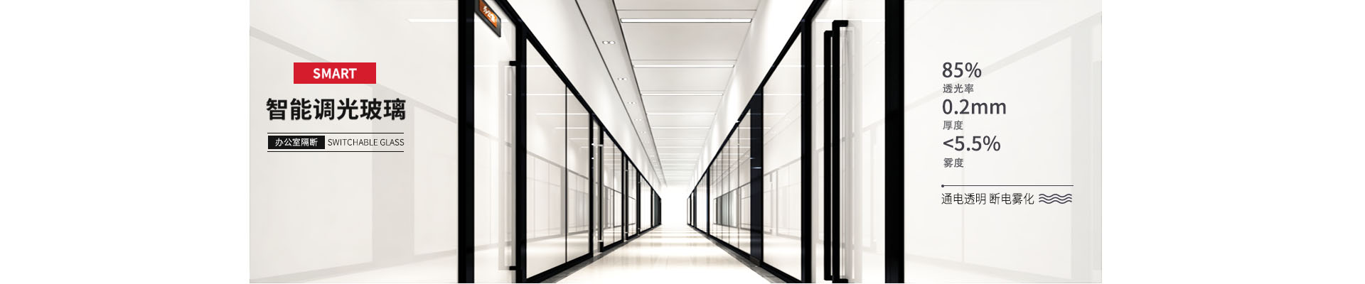 調(diào)光玻璃(又稱霧化玻璃、通電玻璃、智能玻璃),擁有“通電變透明、斷電變霧化”的特性,廣泛用于隔斷墻和門窗,能有效改善空間布局,自由調(diào)整視野空間大小,成為辦公室、酒店、會所、別墅等中高檔場所的時尚選擇。