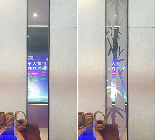 匯馳公司可以定制分區(qū)型圖文調(diào)光玻璃,即玻璃上可以呈現(xiàn)出各種圖形、文字的變化效果,可固定呈現(xiàn),也可動態(tài)呈現(xiàn),用遙控就能輕松控制。只有調(diào)光膜生產(chǎn)廠家,才有能力生產(chǎn)分區(qū)型調(diào)光玻璃。